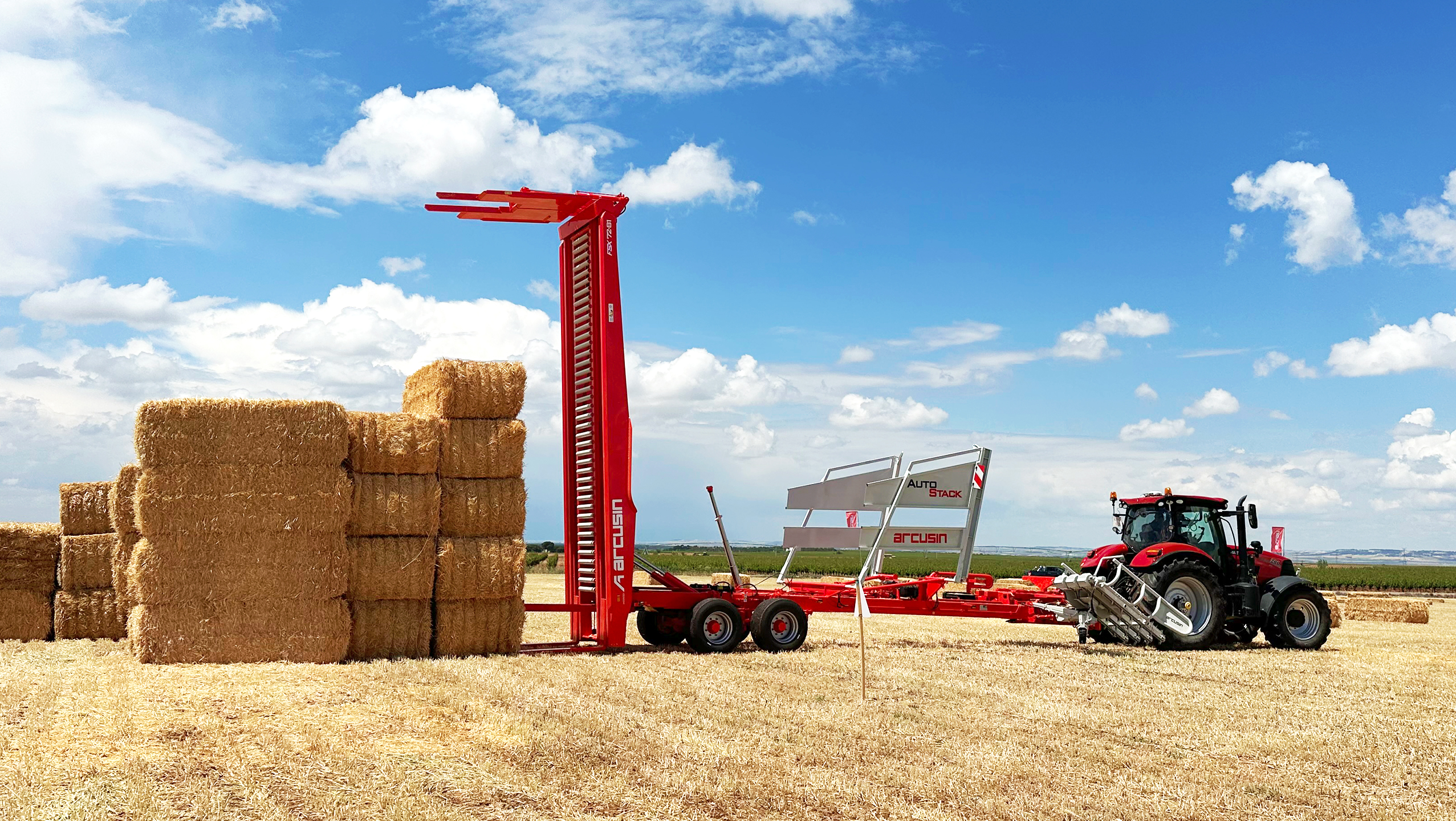 Antes de comprar su primera apiladora Arcusin, Marcos era responsable de la formación de fardos con una empacadora Case LB 434 XL y María iba detrás con su manipulador telescópico recogiendo sus pacas de 120x70 y cargándolos en los camiones. Parte de la paja se dejaba apilada en el campo y se vendía directamente, y la otra parte se recogía y almacenaba para ser vendida a lo largo del año. Tenían un conductor de camión que les ayudaba, pero cuando se retiró en 2021, los hermanos tuvieron que tomar una decisión. En ese momento, decidieron invertir en una apiladora de pacas que les permitiera limpiar los campos más rápido y evitar que los paquetes quedaran mucho tiempo en el campo, especialmente en los últimos años cuando los chubascos inesperados los han sorprendido varias veces.