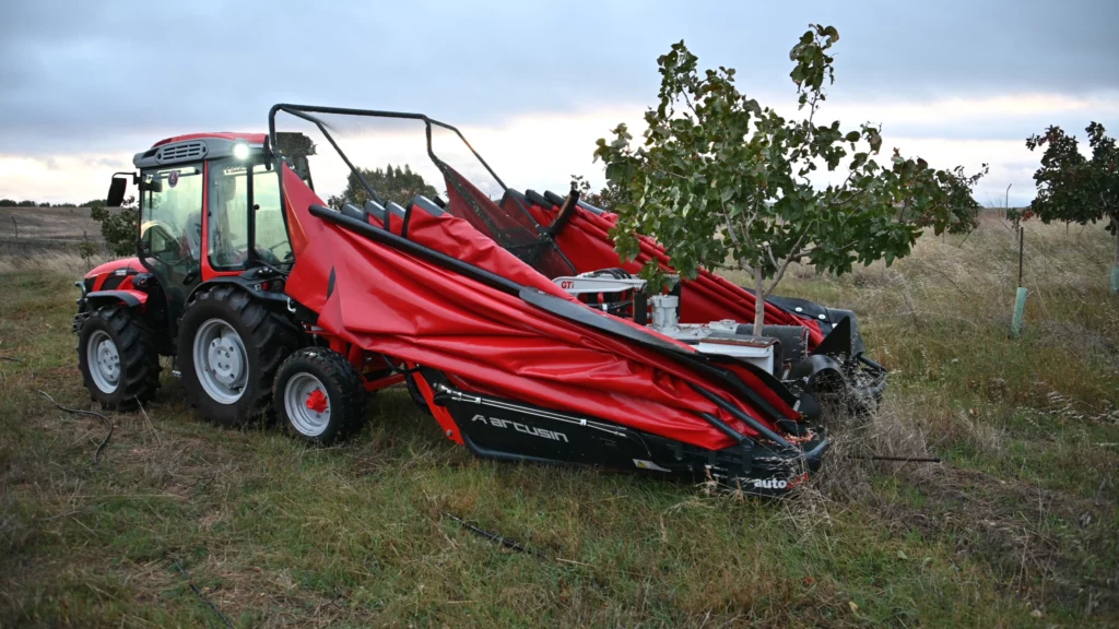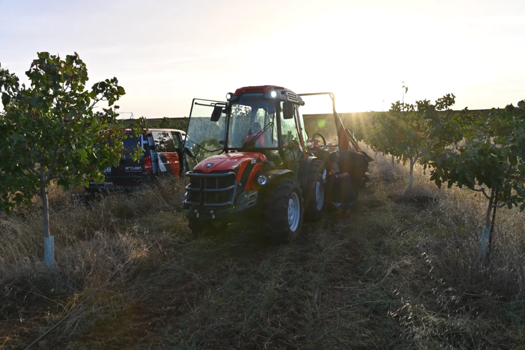 Im September und Oktober dieses Jahres reiste Arcusin auf die Farm, um die große Effizienz des AutoPick GTi-Schüttlers zu demonstrieren und so am Erfolg der Ernte 2023 teilzuhaben. Der Betrieb verfügt derzeit über eine Plantage mit 4.500 Bäumen, die zwischen 4 und 5 Jahre alt sind und für ihr junges Alter eine hervorragende Produktion und Qualität aufweisen. Die Maschine schüttelte mit einer Frequenz von 90/100 Pistazien pro Stunde, ohne die Stämme mit einem Durchmesser zwischen 2 und 7 cm zu beschädigen, und mit einem reduzierten Pflanzrahmen von 4,5 x 4,5 m. Der kompakte Traktor Antonio Carraro ist außerdem sehr wendig und damit eine ideale Traktor-Schüttler-Kombination für diese Art von Plantage.